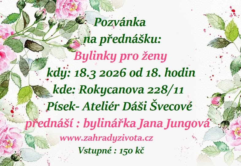BYLINKY PRO ŽENY Zajímá vás, které bylinné a další, přírodní prostředky, můžeme použít pro udržení zdraví, harmonii a krásu ženy? Ráda, se s vámi podělím, o své poznatky a zkušenosti, z mé bylinářské a terapeutické praxe. Hlavní témata přednášky:- bylinky k pěstění krásné pleti a vlasů- bylinky pro naši psychickou pohodu- harmonizace hormonálního systému ženy- co funguje, na premenstruační syndrom- jak zmírnit klimakterické potíže- účinné bylinky na gynekologické záněty a další, ženské potíže... (možnosti přírodní léčby...)- bylinné posílení při chronických infekcích...- bylinky proti přibírání na váze, když se nám tvoří hormonální bříško... - co použít, na celulitidu a otoky - psychosomatické příčiny fyzických potíží (když na nás naše tělo ,,mluví,,)- jaké doplnit přírodní vitamíny, minerály...Povíme si více, o vhodné aplikaci bylinných prostředků- nálevy, čaje, tinktury, sedací koupele, masti a další možnosti…Samozřejmě, si představíme konkrétní bylinky, jejich účinky a možnosti použití, a také, vyzkoušené bylinné směsi a receptury.Přednáší: bylinářka Jana Jungová (nar. 1967), která se zabývá pěstováním a použitím léčivých rostlin více, než 30 let, a může vám tak předat vlastní, v praxi získané poznatky a zkušenosti.Bude prostor pro dotazy a poradenství.Vstupné- 150 kčV případě zájmu, se mi prosím ozvěte na email: jana@zahradyzivota.czPočet míst je omezen. Těším se, na setkání s vámi a bylinkami. Mé další akce, najdete na webu zahradyzivota Bylinářka Jana ze Přehájku.